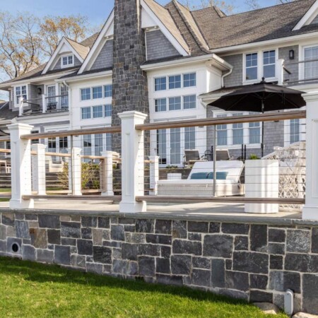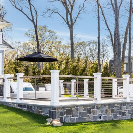 One of the most striking features of this project is the custom railing system with tension wire. This modern design choice preserves the spectacular water views while ensuring safety and compliance with local building codes. The combination of white posts and horizontal cables creates a nautical feel that’s perfectly suited to the waterfront setting. We installed two custom self-closing gates for convenience and added safety.