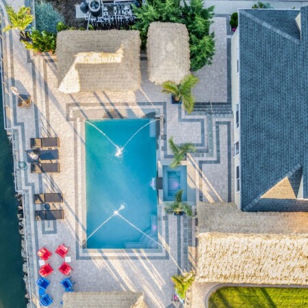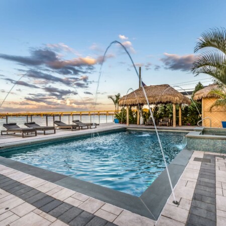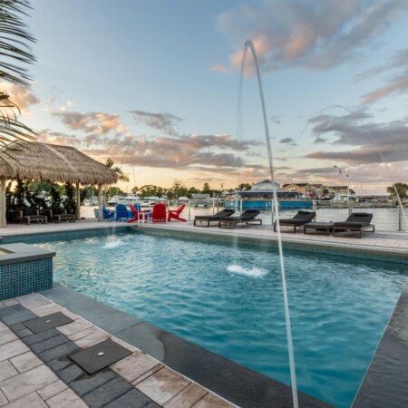 Working in collaboration with Key West Tiki, we incorporated authentic tropical elements including thatched-roof cabanas that serve as both changing rooms and shaded lounging areas. The custom tiki bar creates an ideal entertainment space, perfectly positioned to enjoy stunning sunset views over the water.